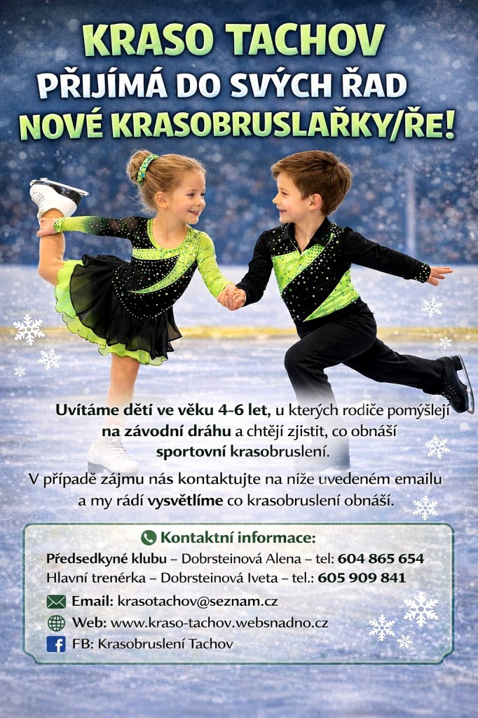 Hledáme holčičky nebo kluky ve věku 4-6 let, kteří nemají nouzi o dobrou náladu a rádi se učí novým věcem. Vyberte pro své dítko sport, který podporuje imunitu, učí odvaze, trpělivosti a dá jim všeobecnou pohybovou průpravu na ledě i mimo něj. ❄️ Dopřejte svým dětem radost z pohybu na ledě pod vedením našich zkušených trenérek. Možná právě u nás začíná jejich nový velký příběh v tomto nádherném elegantním sportu. 🏆🥇🥈🥉Veškeré kontaktní informace najdete na přiloženém plakátu. Těšíme se na Vás na zimním stadioně v Tachově. 💫⛸️💚